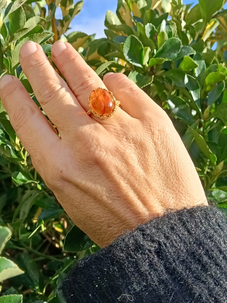 Bague cuivre plaqué or, avevc pierre ambre baltique (certificat d’authenticité)