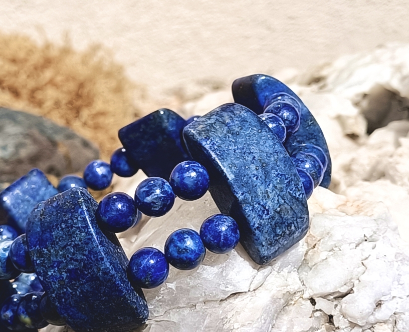 Magnifique bracelet conçu à partir de perles en lapis lazuli, ronde et rectangulaires.