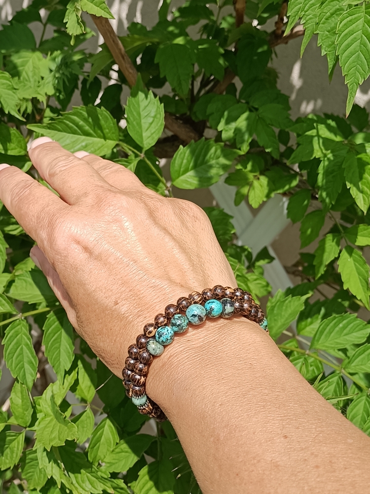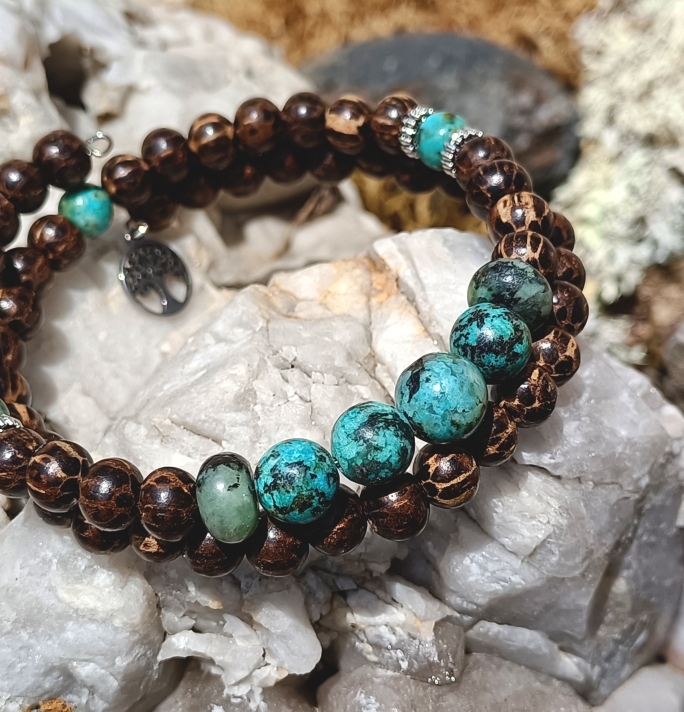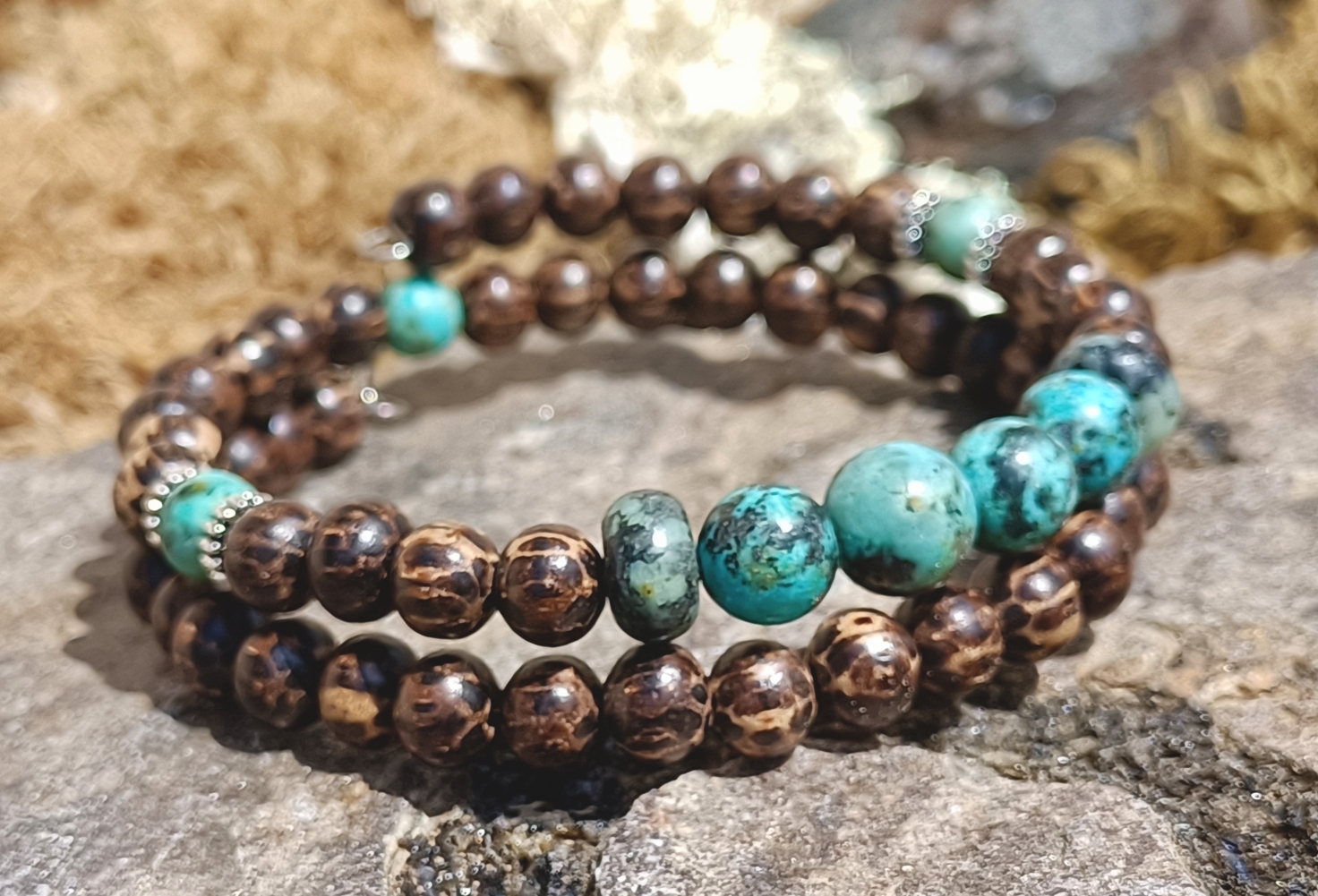 Bracelet double en palmier et turquoise africaine, rayonnant les énergies de l’apaisement, protection, communication, positivité, communication, confiance en soi, énergie.
