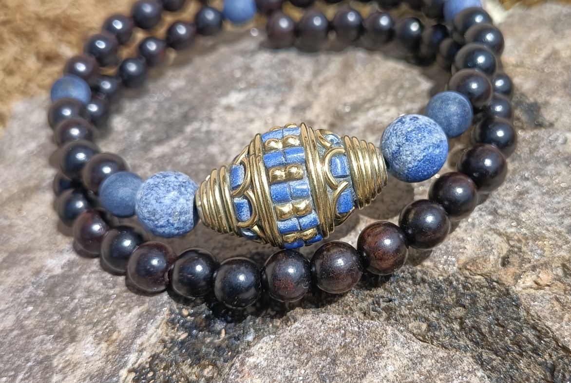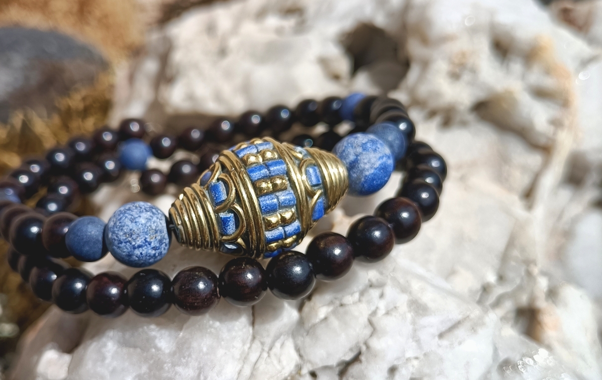 Crée avec des perles de bois d’ébène et des perles de lapis lazuli mat, ce bracelet apporte les énergies de communication juste, pureté et profondeur, protection, confiance en soi et vitalité.