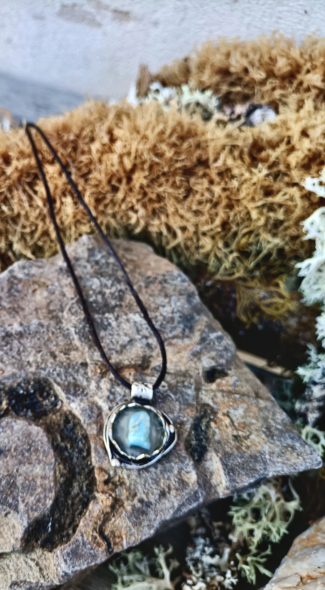 C’est une création style antique, simple, composée d’un cœur en rhodonite sur un socle en bronze étoilé, monté sur un cordon en coton ciré noir doublé d’une tulle de la même couleur.